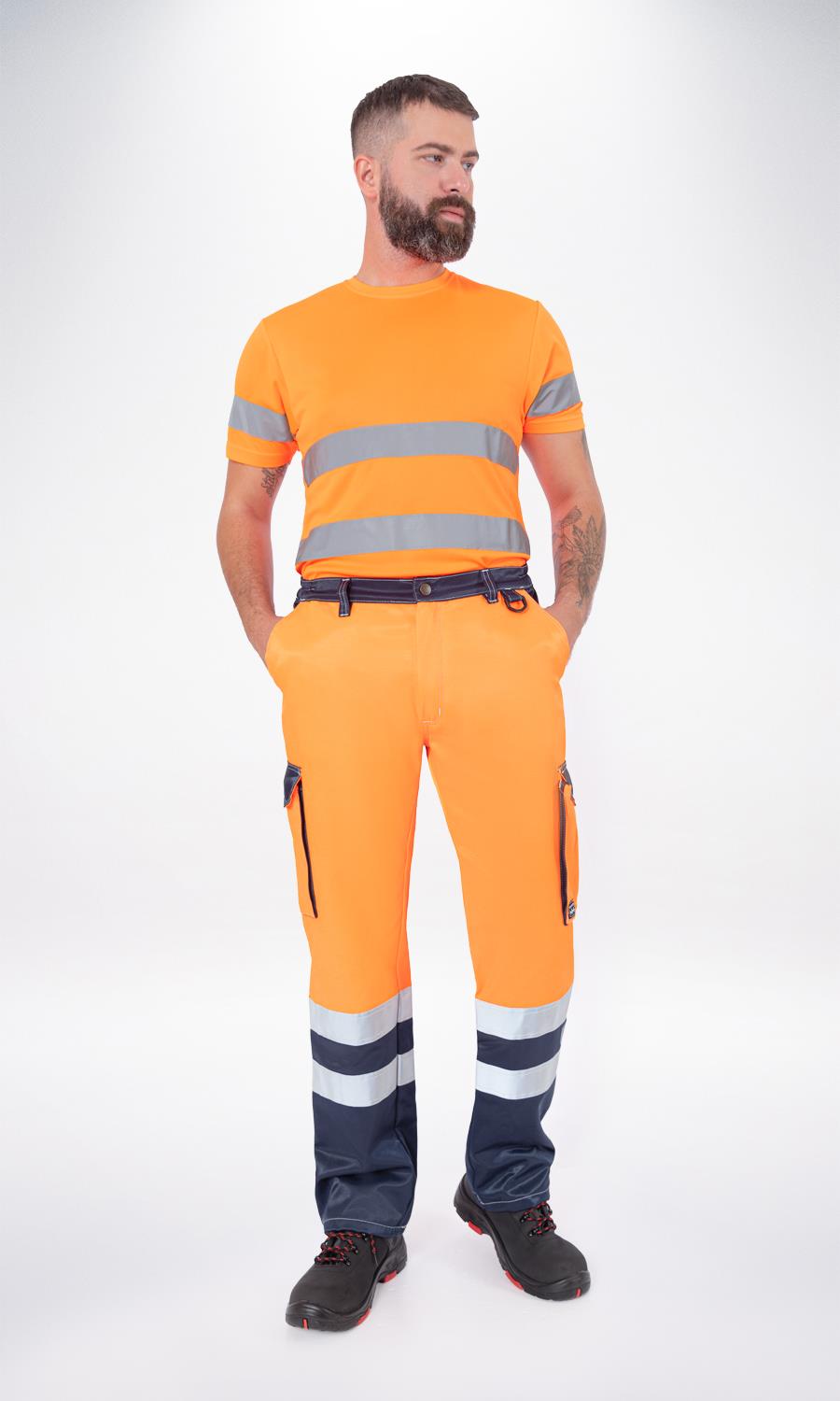 Εργατικό παντελόνι υψηλής ευκρίνειας που κλείνει μπροστά με κουμπί και φερμουάρ υψηλής αντοχής. Δύο τσέπες λοξές μπροστά στη μέση. Δύο τσέπες πίσω που κλείνουν με καπάκι. Δύο τσέπες πλαϊνές στους μηρούς τύπου φυσούνα που κλείνουν με καπάκι και velcro. Κρίκος πρόσδεσης εργαλείων.Πέντε θηλύκια συγκράτησης ζώνης. Δύο ασημί ανακλαστικές ταινίες περιμετρικά στα μπατζάκια. Λάστιχο στα πλαϊνά της μέσης. Γαζιά ασφαλείας. Ελληνικό προϊόν.