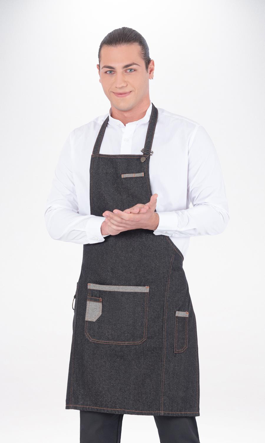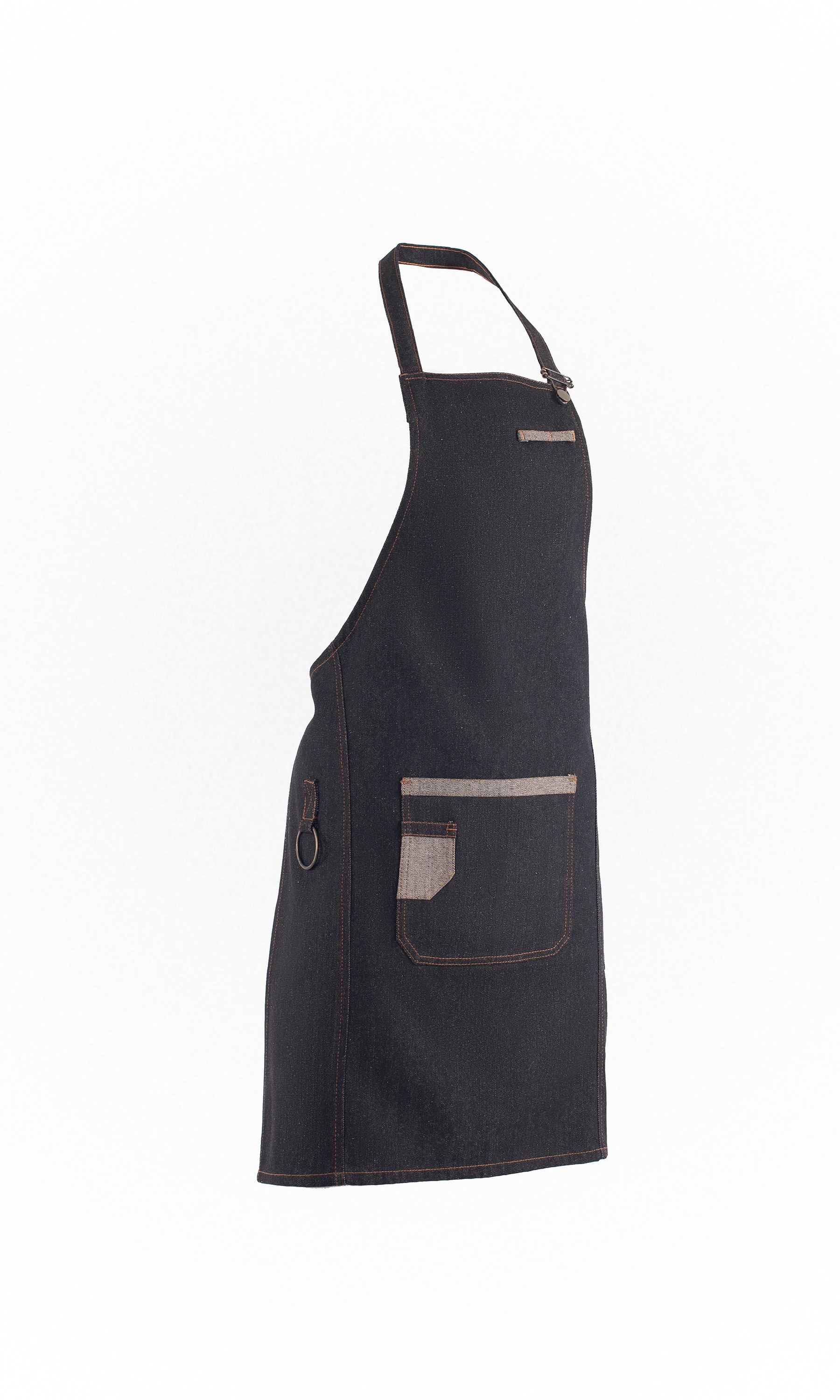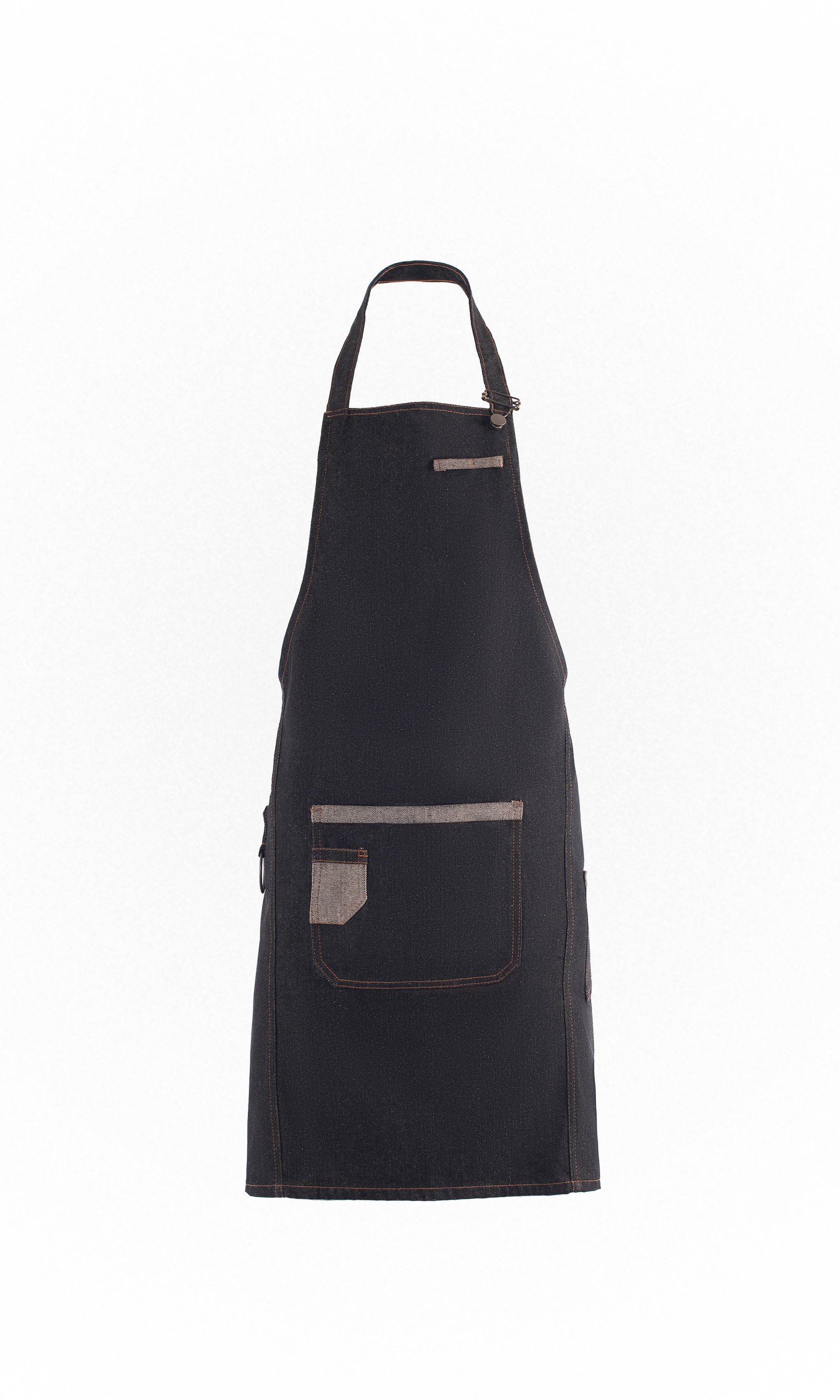 Neck apron made of black jeans, with metallic bronze fastener for easy use. One large pocket in the center with attached decorative pocket. One pocket at the bottom left. Bronze metallic ring for a towel. Decorative loops on the chest. Greek product.