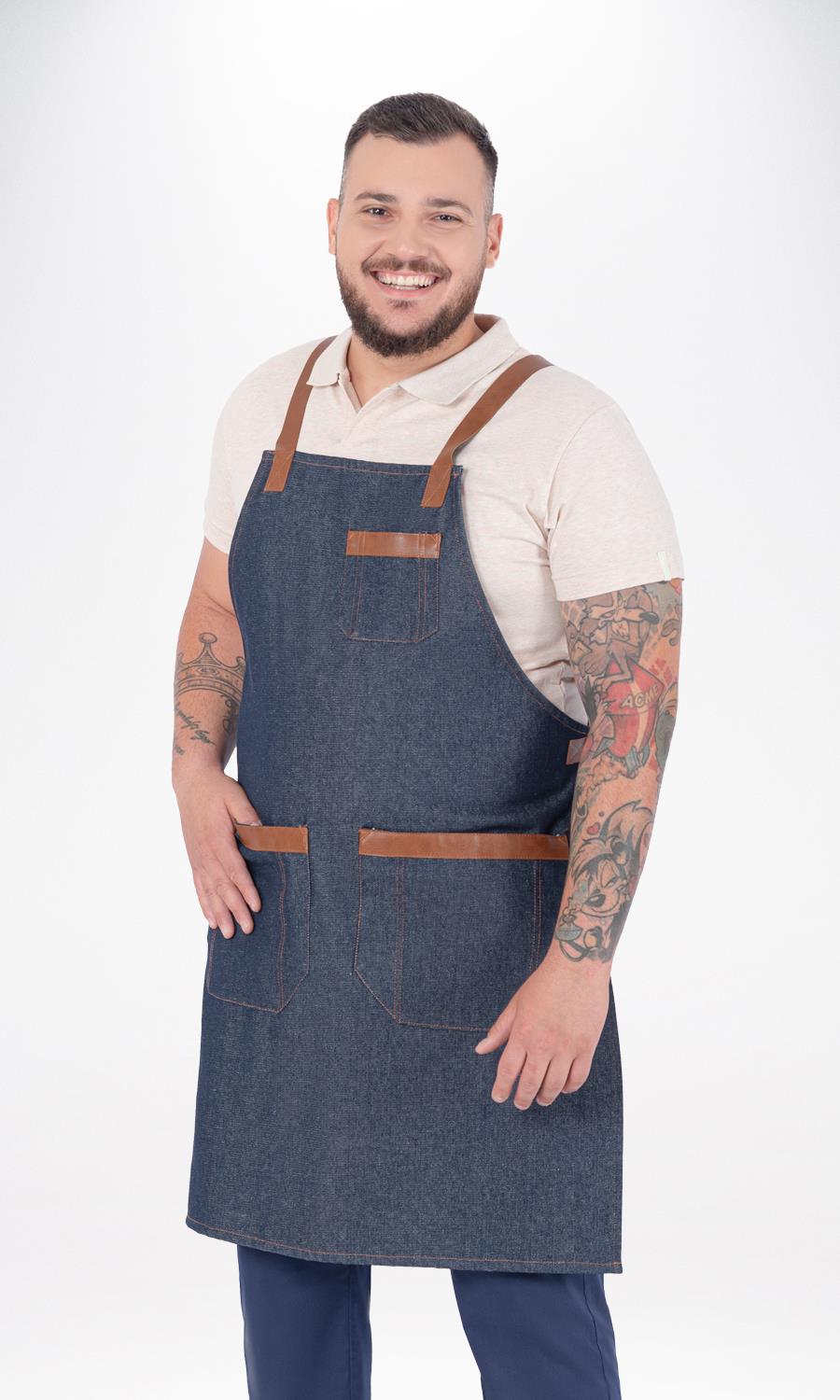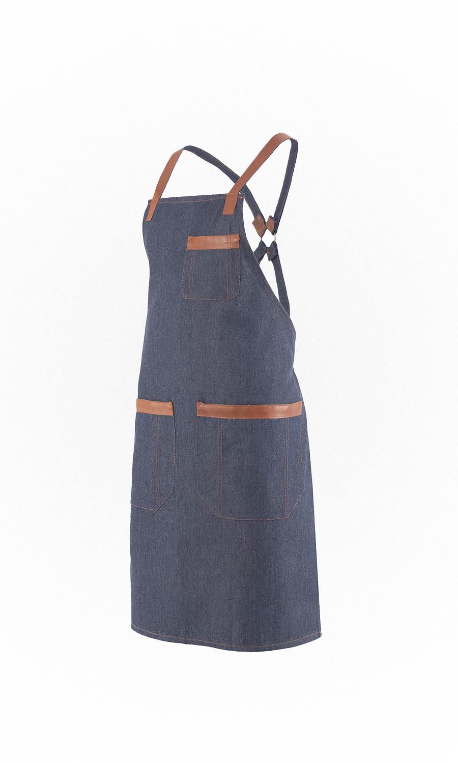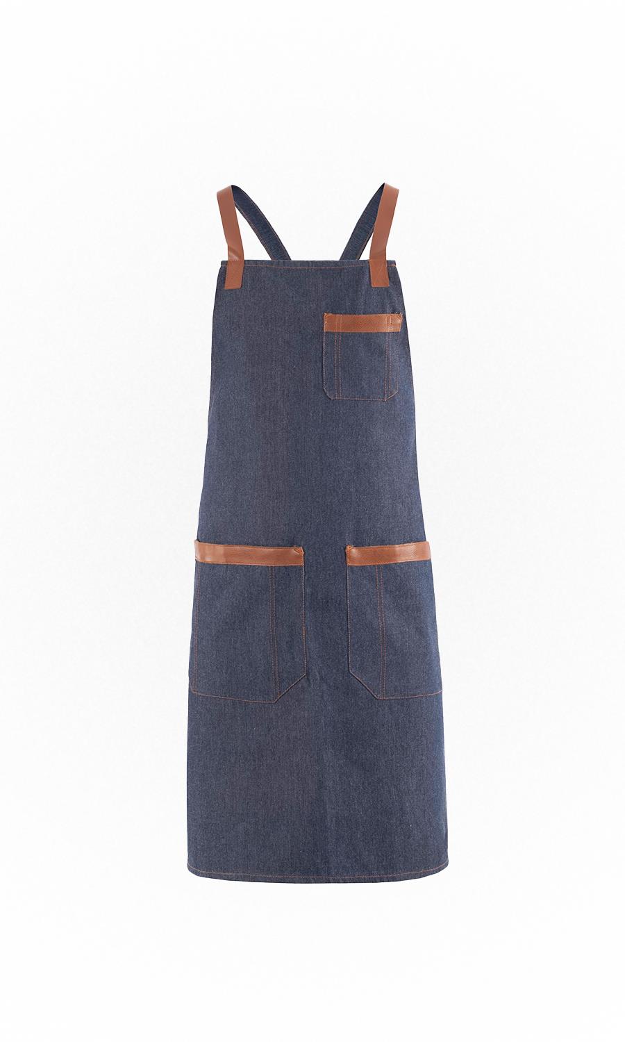 Denim neck apron, with crossed synthetic leather straps and metal ring on the back. Three pockets with leather details, one on the chest and two in the middle on the right and left. Metallic towel ring. Greek product.