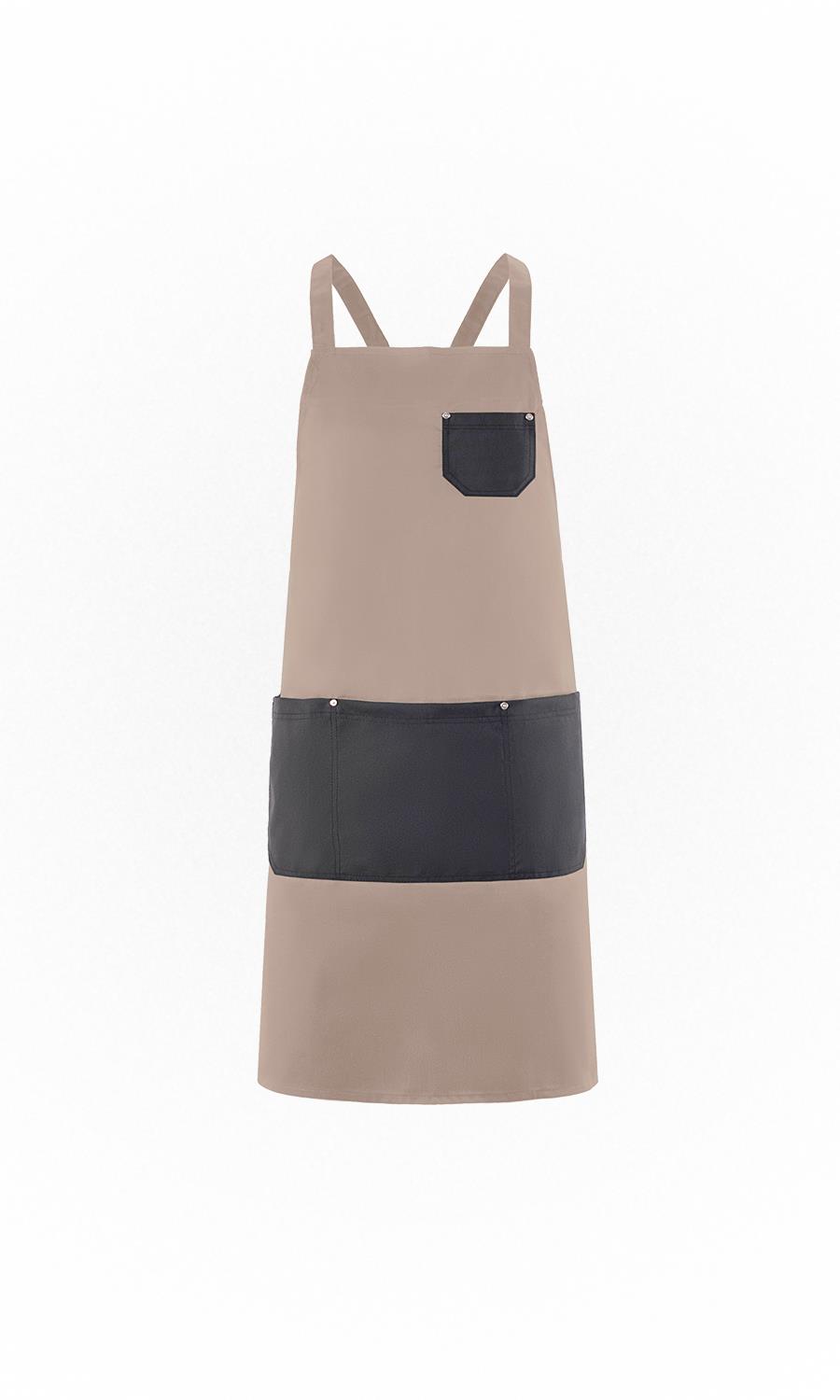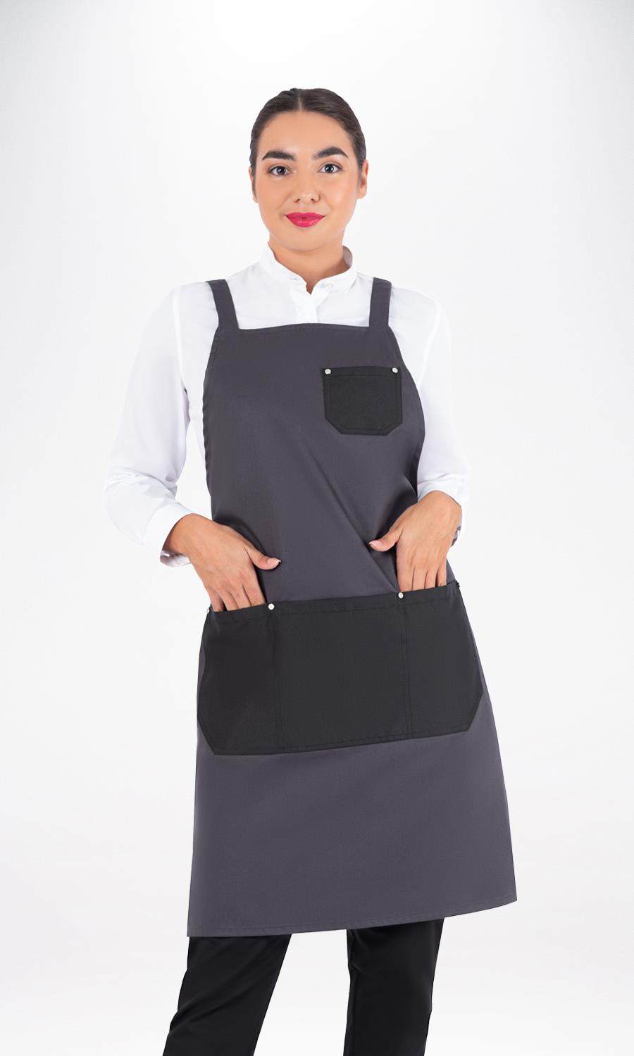 Bib apron with cross straps on the back and metal hoop. Triple front pocket and one front pocket small pocket on the chest with decorative rivets. The pockets are made of oxford polyester fabric. Greek product.