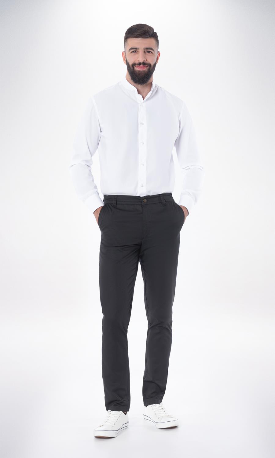 Men's chino pants with two pockets in the front. Closes with zipper and button. 5 loops on the waistband and elasticated sides. Greek product.