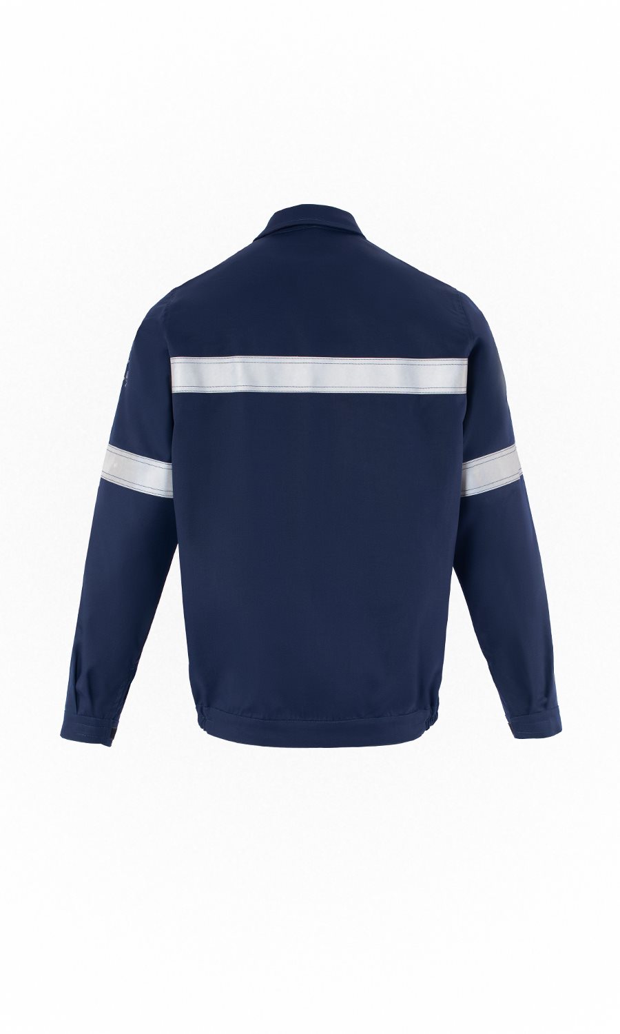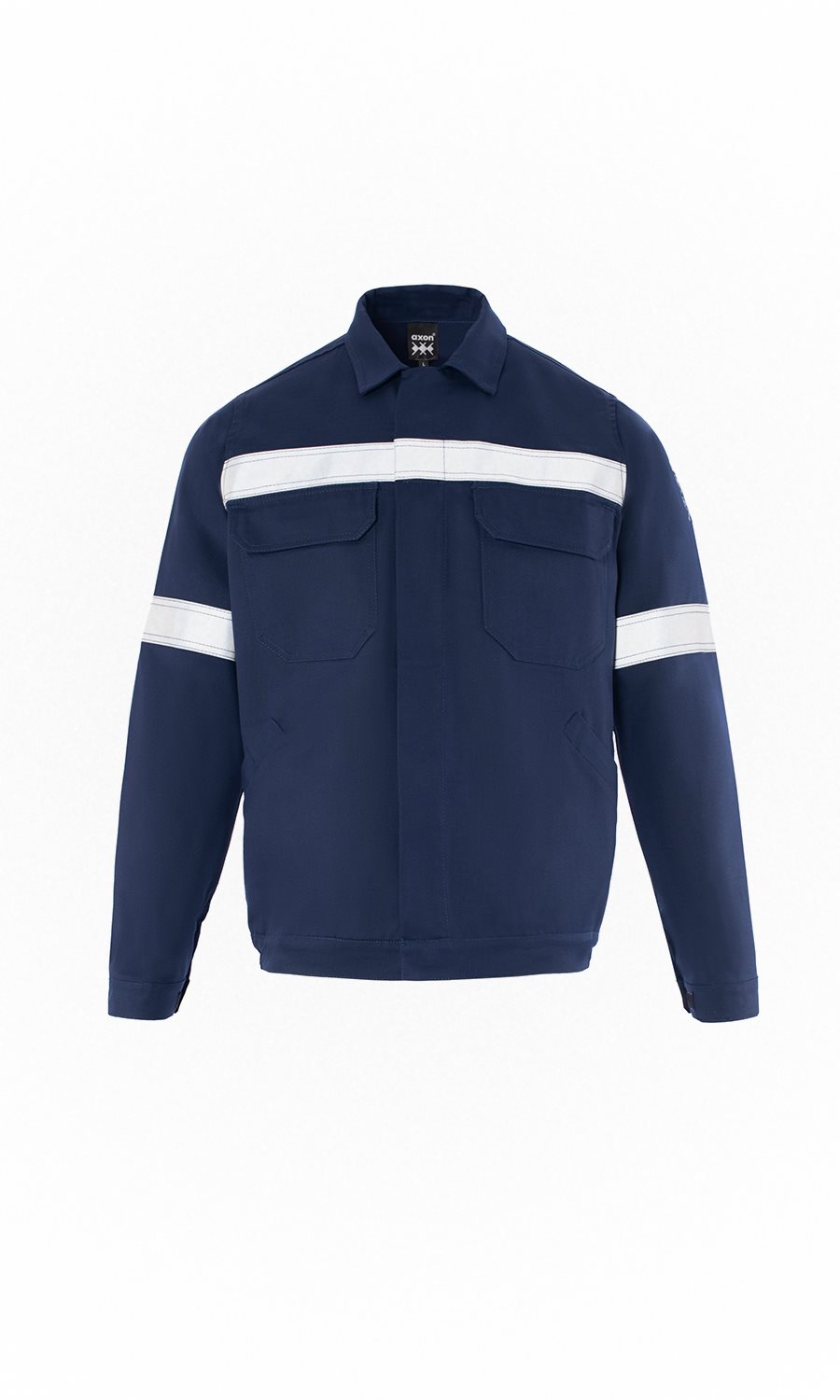Multi-Protection jacket with two pockets in the chest that close with a flap and FR velcro. Two waist pockets. Closes in front with FR velcro covered with placket. Silver, FR, reflective tape 5cm on the sleeves and around the chest and back. Double stitching with Aramid fibres with excellent mechanical resistance. Safety cuffs that close with FR velcro. Elasticated sides of the waist. FR finish, resistant to limited exposure to water and liquid chemicals. Suitable for use in petrochemical industries. Greek product.